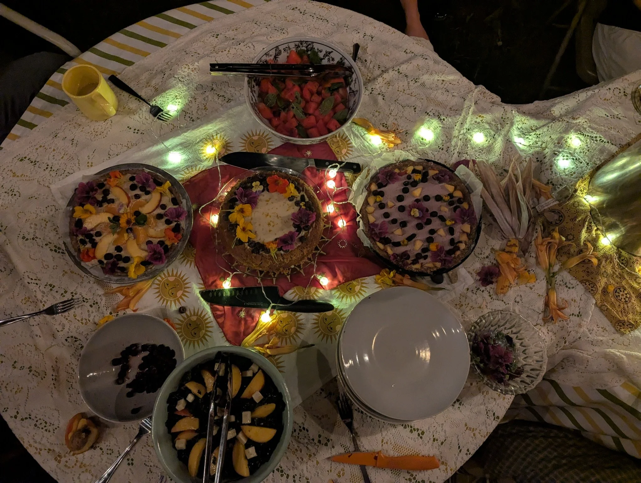 A couple weeks ago we rang in Summer Solstice with a beautiful dinner and celebration. Through sparkles and silliness, we summoned our sun gratitude and gathered under the golden sky, sharing songs, fried day lilies, mulberry-peach pies, and orange cardamom cake.