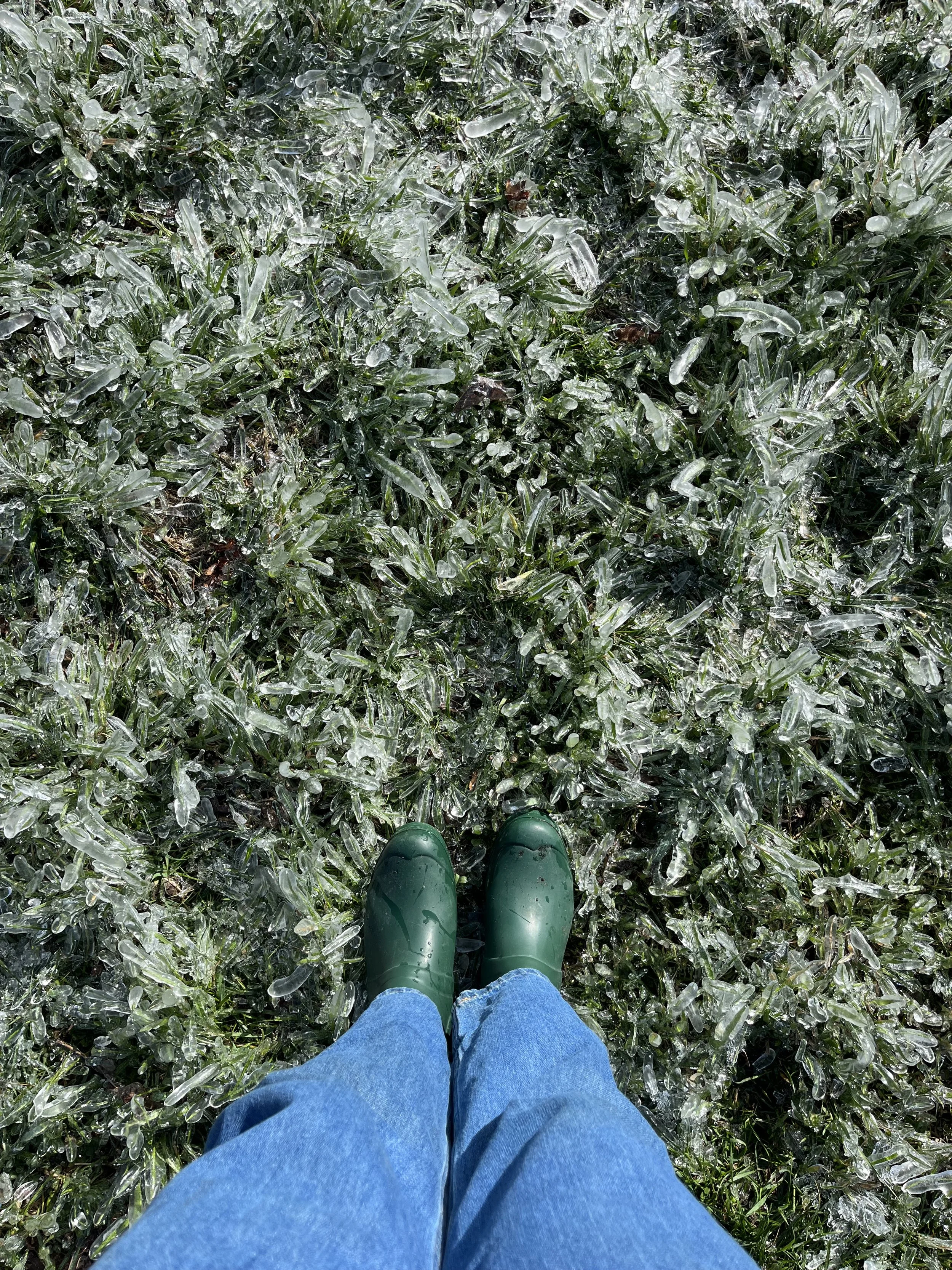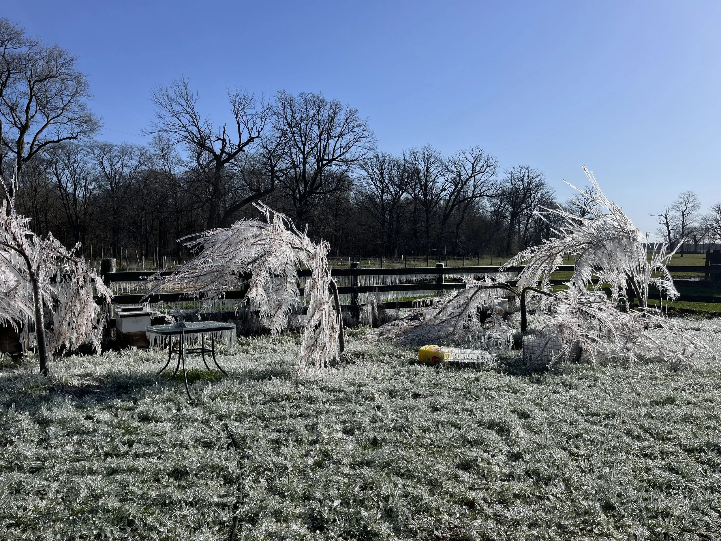 The only silver lining is that leaving the sprinklers on all night created an otherworldly frozen landscape around the trees.